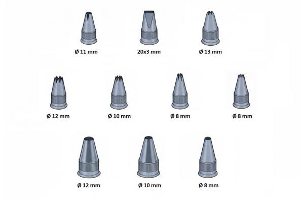 - Round, Ø 11 mm, with side cut - Rectangular, 20x3 mm, with one smooth side and one serrated side - Star-shaped, Ø 13 mm with closed teeth on the inside - Star-shaped, Ø 12 mm - Star-shaped, Ø 10 mm - Star-shaped, Ø 8 mm - Star-shaped, Ø 8 mm, with small points - Round Ø 12 mm - Round Ø 10 mm - Round Ø 8 mm